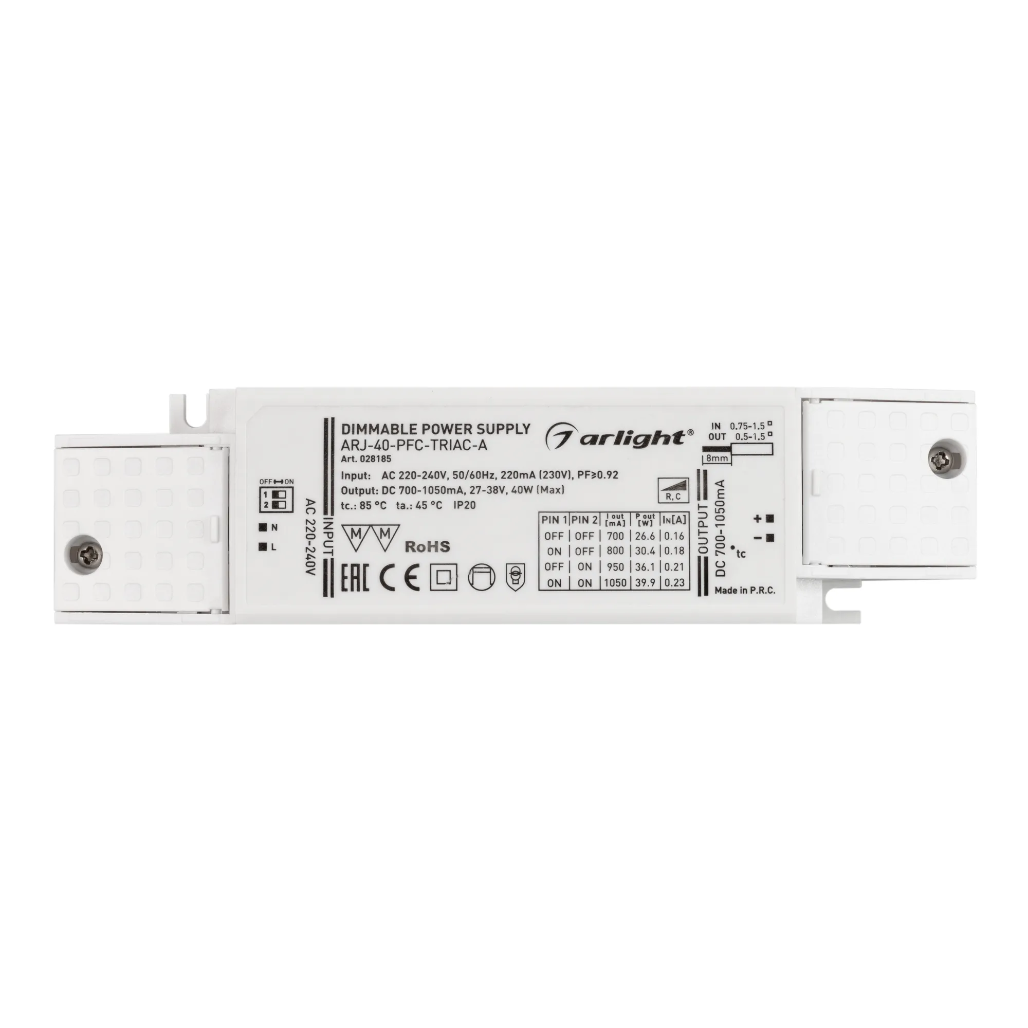 Диммируемый источник тока по стандарту TRIAC с гальванической развязкой для светильников и мощных светодиодов. Входное напряжение 220-240 VAC. Выходные параметры: 27-38 В, 700-1050 mА, 40 Вт. Выбор значения тока осуществляется DIP-переключателем. Встроенный PFC >0,92. Негерметичный пластиковый корпус IP 20. Габаритные размеры длина 172 мм, ширина 44 мм, высота 30 мм. Гарантийный срок 5 лет.