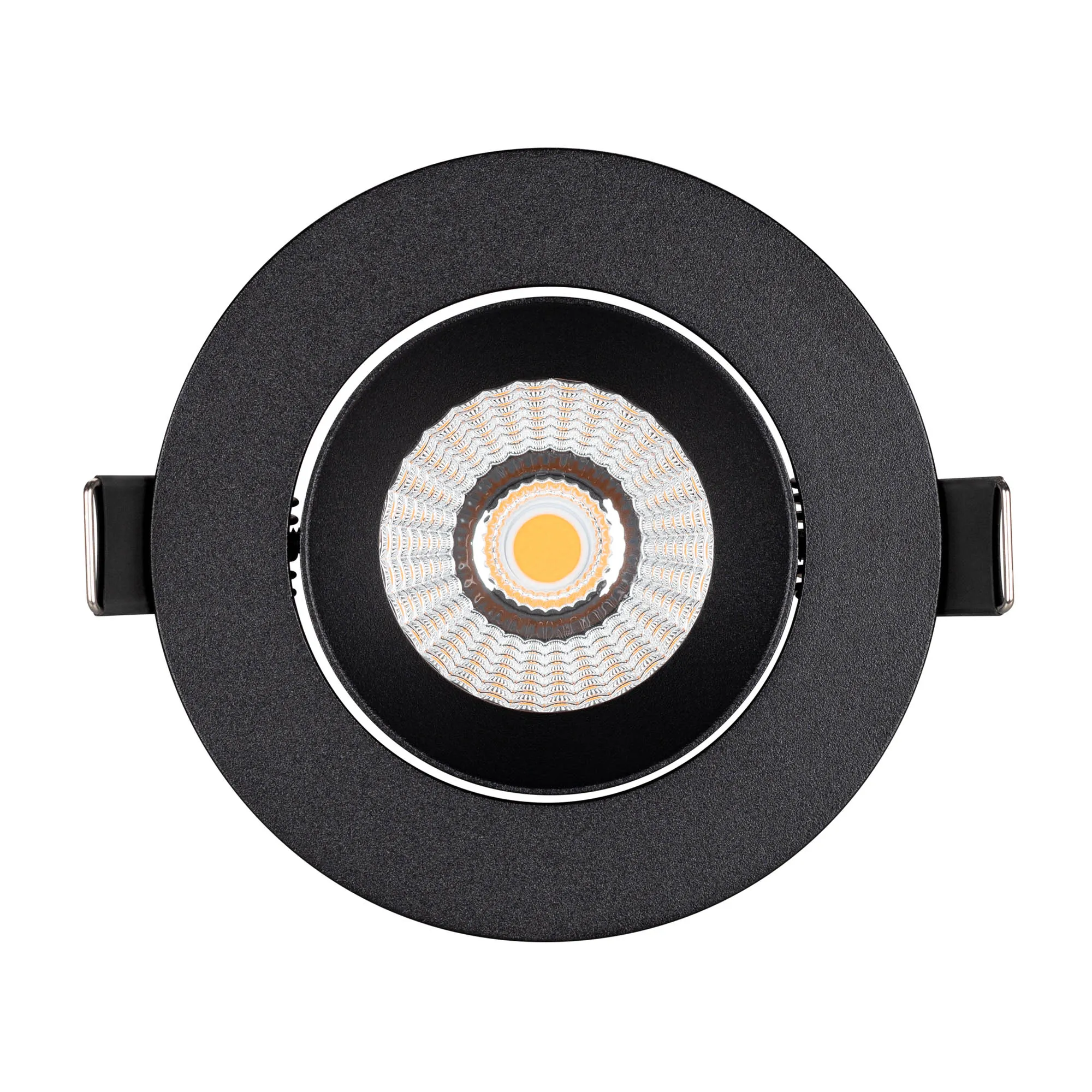 Встраиваемый поворотный светильник даунлайт. Мощность 10 Вт, св. поток 750 лм, 75 лм/Вт, тёплый 3000 K, CRI>90, угол 60°, напряжение питания 230 В. Чёрный круглый корпус из алюминия, экран PMMA, степень защиты IP54. Размер: диаметр 94 мм, высота 75 мм. Монтаж встраиваемый, установочное отверстие: диаметр 77 мм. Драйвер IP54, 20-40 В, 250 мА, пульсация <1%.